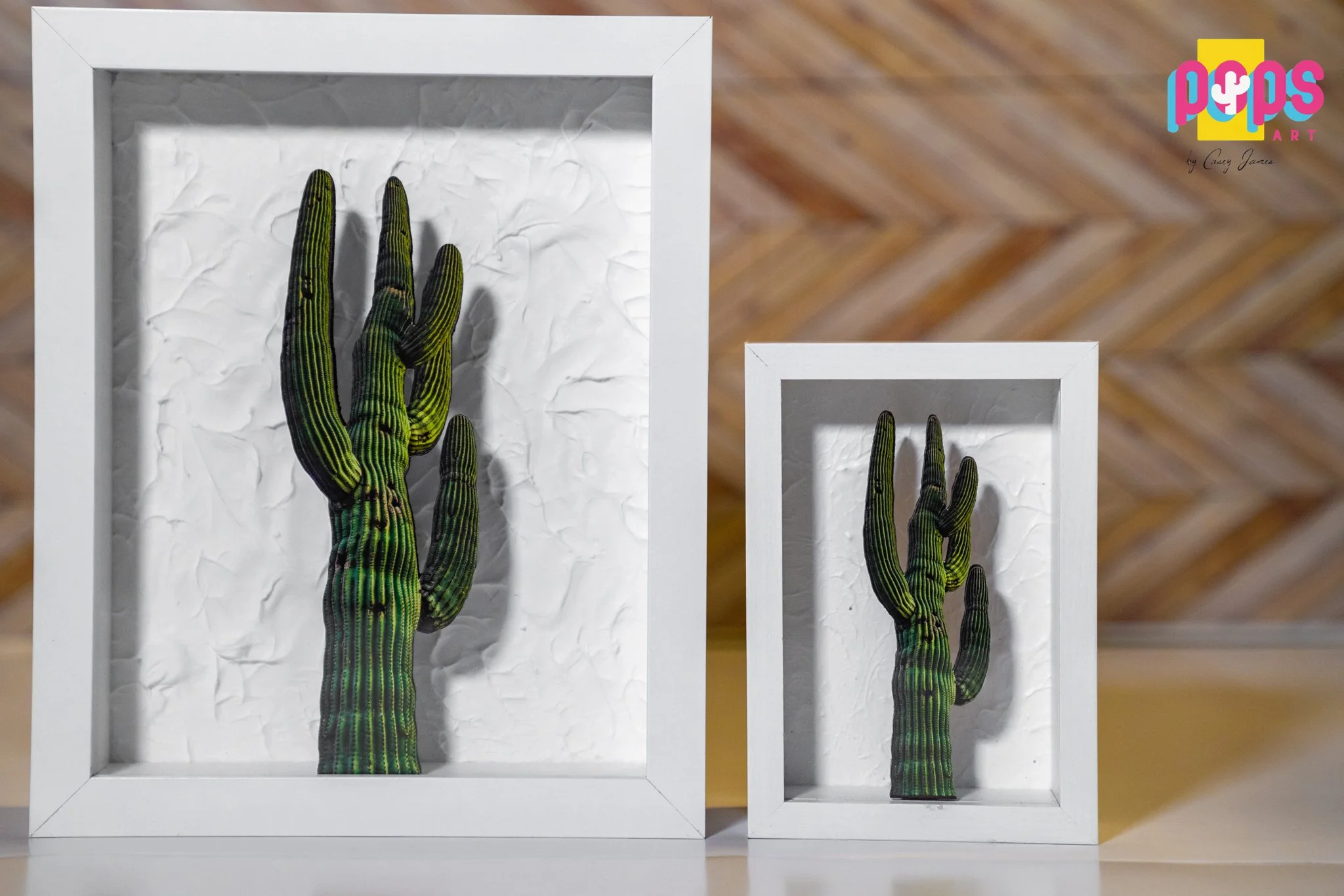 High-Definition Prints of Arizona Cactus captured and re-created into Art to last forever. These 3D High Quality Wood-Cut Saguaro Cactus Displays are mounted in front of various vibrant acrylic painted canvas in a sleek white wooden shadowbox. Each piece is hand-crafted by Tucson, Arizona’s very own Photographer/Artist Casey James.